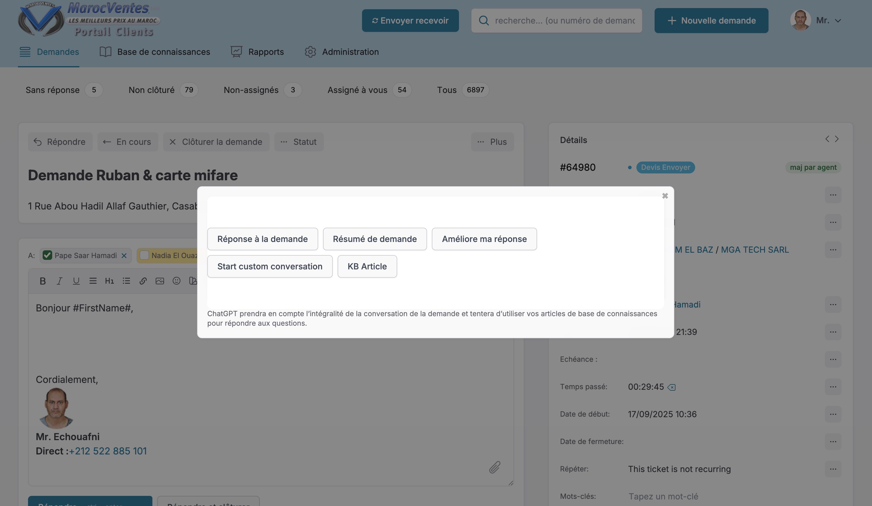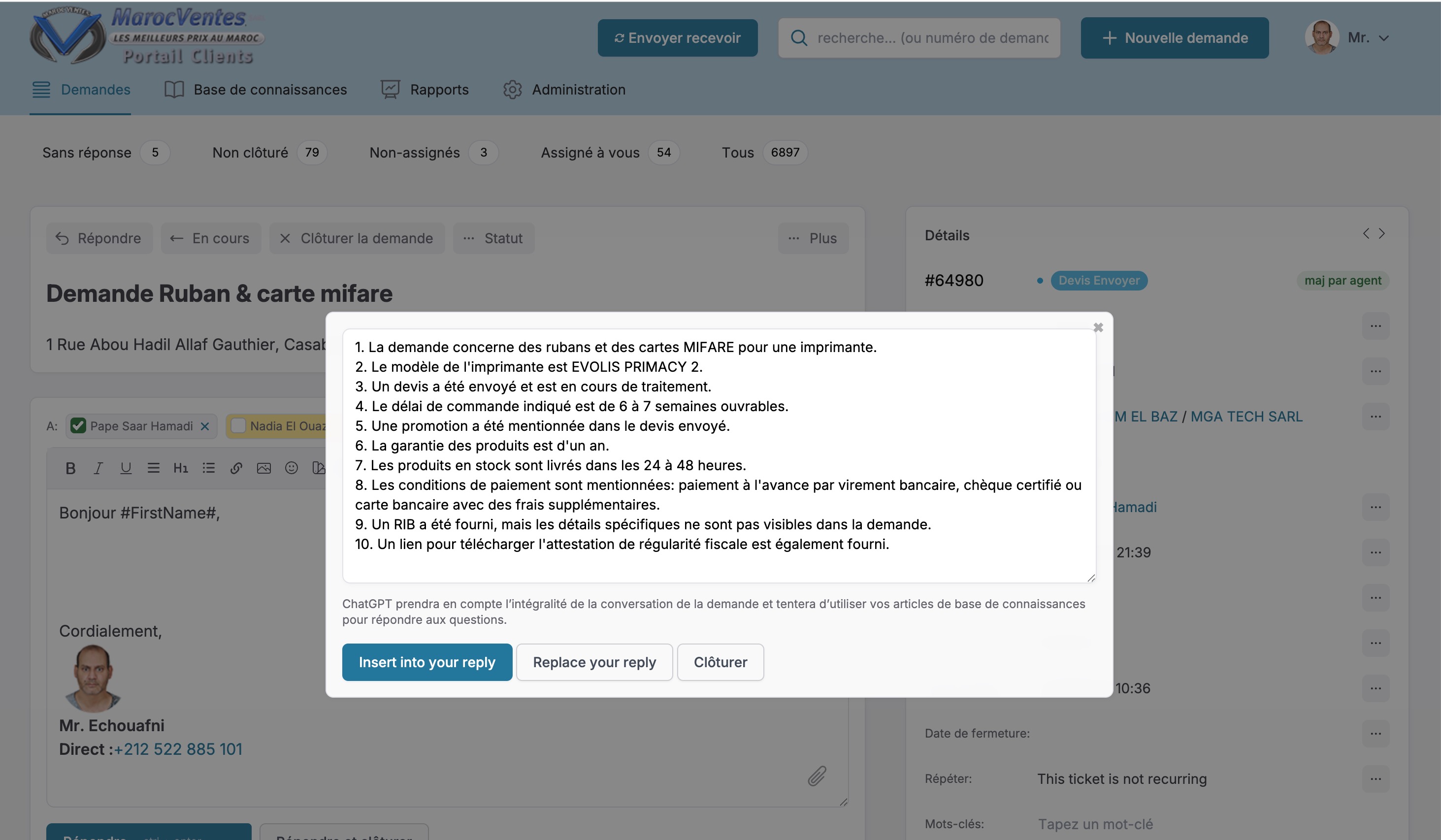 • Mais ce n’est pas tout : l’IA transforme également les demandes récurrentes en articles de base de connaissances, enrichissant automatiquement votre FAQ et réduisant le volume des demande. Vos équipes peuvent aussi échanger en temps réel avec l’IA pour trouver la meilleure formulation et offrir à vos clients une expérience plus fluide, professionnelle et réactive.